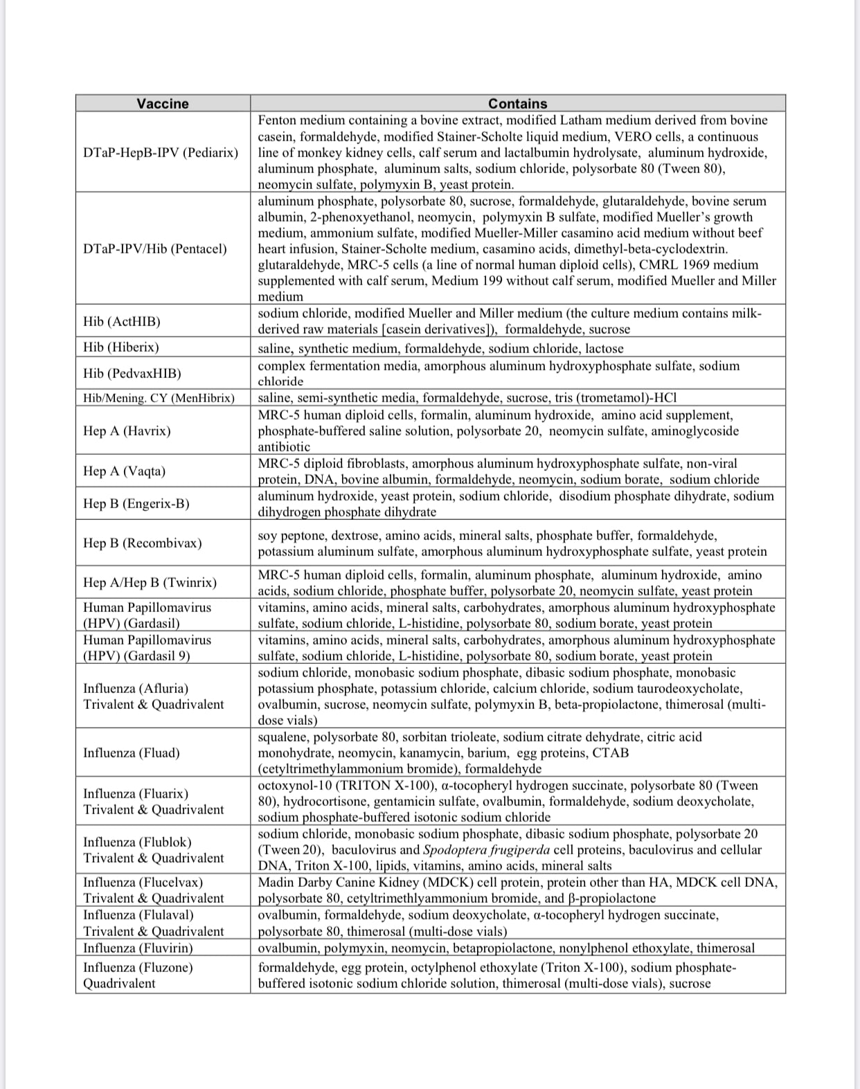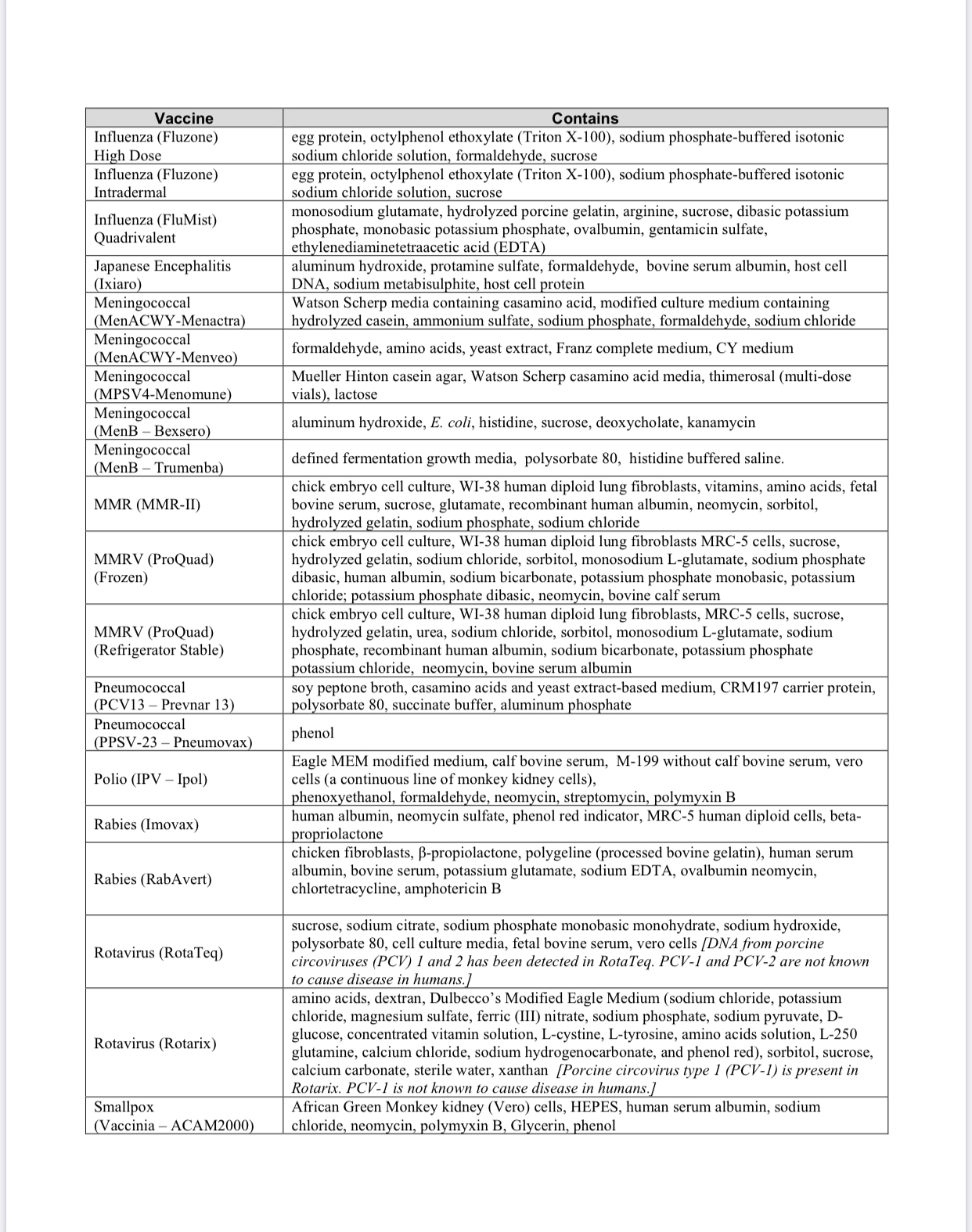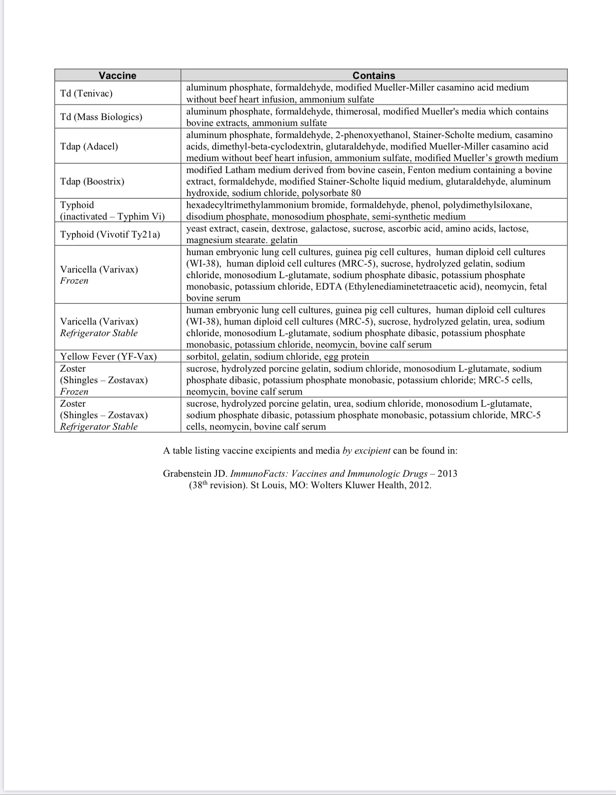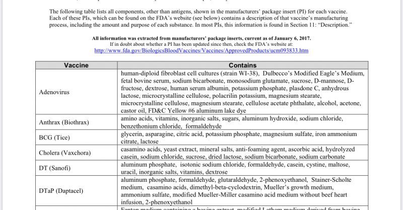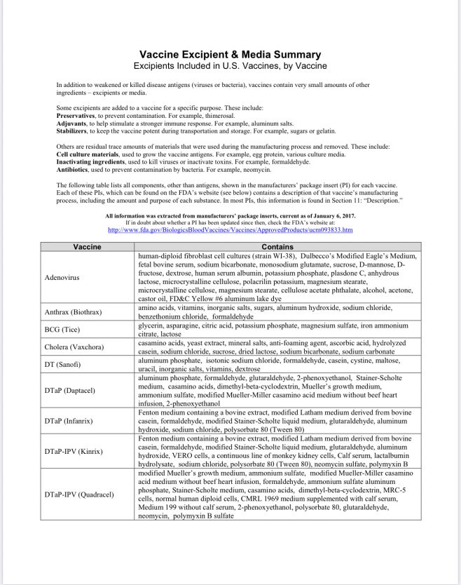 Recently this document was revised to separate out the vaccine excipents from the vaccine media used in production of vaccines; meanwhile, the vaccines continue to contain components of both excipients and media, presumably. [Refer to the document for a description of “excipients” and “media.” In general, they are the “other ingredients” of vaccines in addition to the “active” components.] The document states that the list is derived from vaccine manufacturers’ package inserts [which doctors and nurses typically don’t access in a clinical setting; you can read them online at the FDA website].